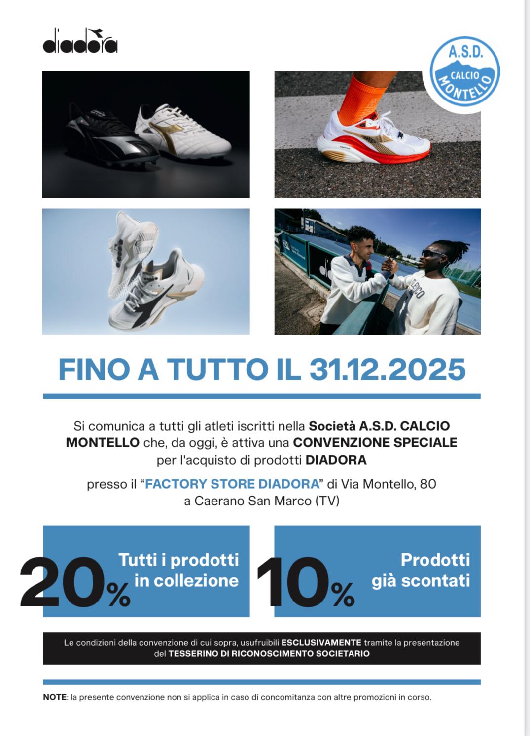 La Società A.S.D. Calcio Montello comunica con soddisfazione di avere attivato una convenzione speciale con DIADORA a favore di tutti i tesserati (giocatori, tecnici, dirigenti, collaboratori) della Società e delle loro famiglie.