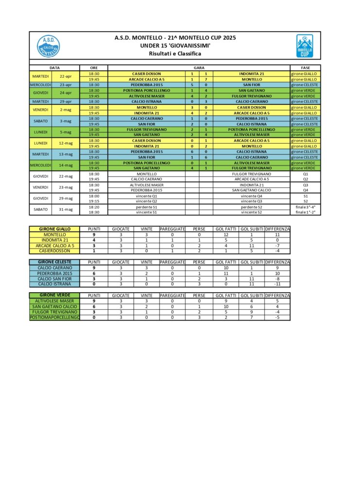 Nel Girone Giallo, la capolista Montello ha dominato con tre vittorie su tre, segnando 12 gol e subendone solo 1, chiudendo a punteggio pieno con 9 punti. Le altre in ordine di classifica: Indomita 21 Treviso, Arcade Calcio a 5 (passa come 2^miglior terza) e CasierDosson.
